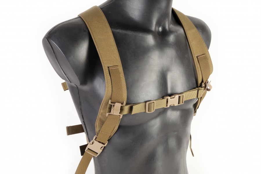 Przy odpowiedniej zgodności producentów klamer, za pomocą szelek możliwe jest również połączenie niektórych chest riggów z plecakami. (Klamry użyte w szelkach to Duraflex Mojave Side Squeeze).